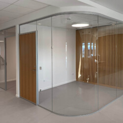 Indvendige glasvægge med cylinderbøjet glas kan skabe organiske former og med et 180 graders view omkring hjørner kan man skabe spektakulære løsninger med f.eks lydisoleret sikkerhedsglas, eller med Smartglas som med et tryk få glasset til at blive uigennemsigtigt.