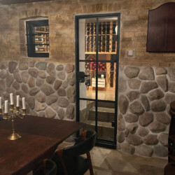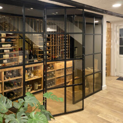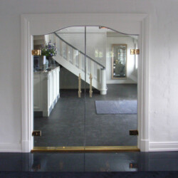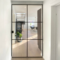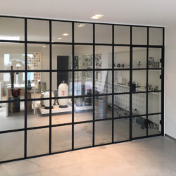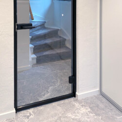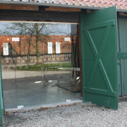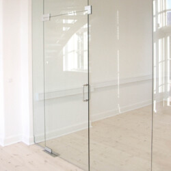 Vi laver forskellige døre til glasvægge, f.eks. integrete i selve glasvæggen med alukarm og tætningslister omkring, eller med en skydedør i glas.